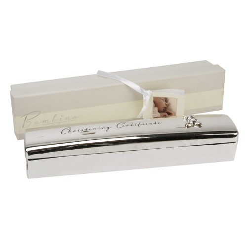 The words '"Christening Certificate" are engraved on the lid. The box measures 23cm long by 4cm deep and 4.5cm wide. Comes presented in a linen bag with bambino tag in a card box.