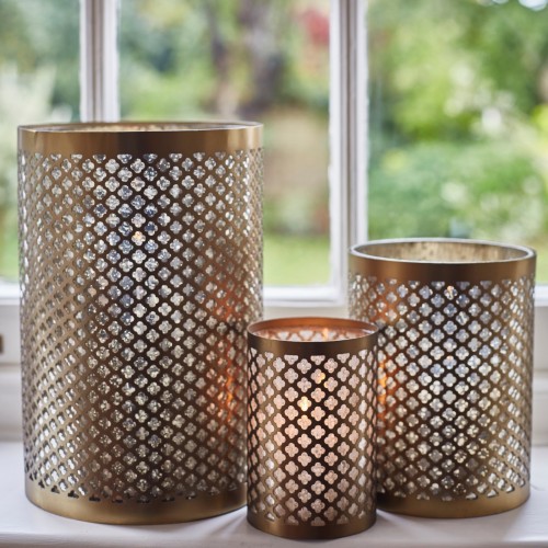 A beautiful nod to the current brass/copper trend in the form of an easy on the eye lantern. Beautifully cut out design with an antiqued mirror inside. Available in three sizes.